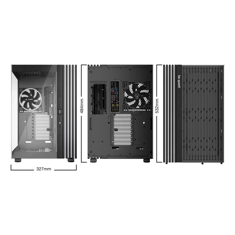 be quiet! LIGHT BASE 900 FX Black. Factor de forma: Full Tower, Tipo: PC, Color del producto: Negro. Factores de forma de la fuente de alimentación compatibles: ATX, PS2. Ventiladores laterales instalados: 3x 140 mm, Diámetro de ventiladores secundarios soportados: 120,140 mm, Ventiladores traseros instalados: 1x 140 mm. Tamaños de disco duro soportados: 2.5,3.5". Ancho: 327 mm, Profundidad: 532 mm, Altura: 484 mm