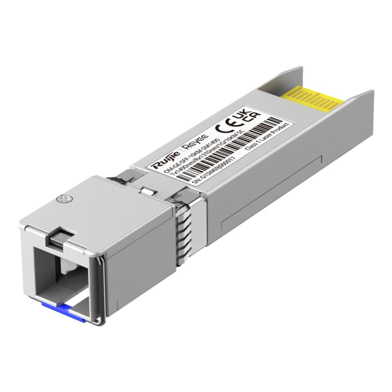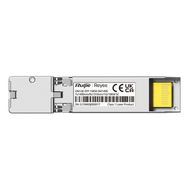 Ruijie Networks OM-GE-SFP-10KM-SM1490. Tipo de transceptor SFP: Fibra óptica, Rango máximo de transferencia de datos: 1250 Mbit/s, Tipo de interfaz: SFP. Color del producto: Metálico, Factor de forma: SFP. Voltaje de entrada: 3.3 V, Voltaje máximo: 3.46 V. Certificados de cumplimiento: CE, UKCA. Peso: 35 g