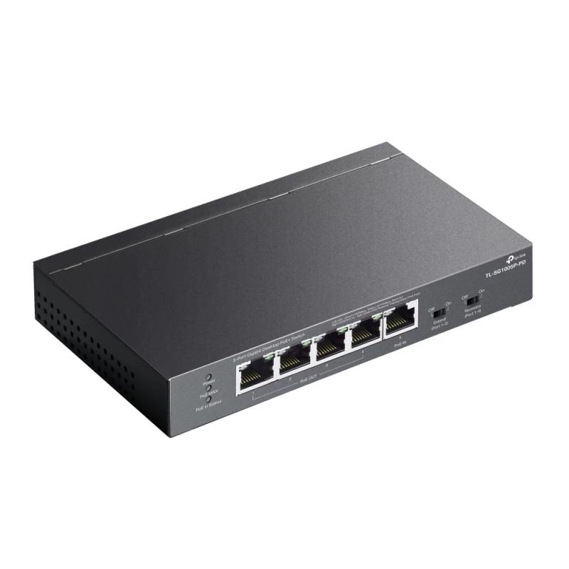TP-Link TL-SG1005P-PD. Puertos tipo básico de conmutación RJ-45 Ethernet: Gigabit Ethernet (10/100/1000), Cantidad de puertos básicos de conmutación RJ-45 Ethernet: 5. Tabla de direcciones MAC: 2000 entradas, Capacidad de conmutación: 10 Gbit/s. Estándares de red: IEEE 802.1p, IEEE 802.3ab, IEEE 802.3af, IEEE 802.3at, IEEE 802.3bt, IEEE 802.3i, IEEE 802.3u,.... Energía sobre Ethernet (PoE). Montaje de pared