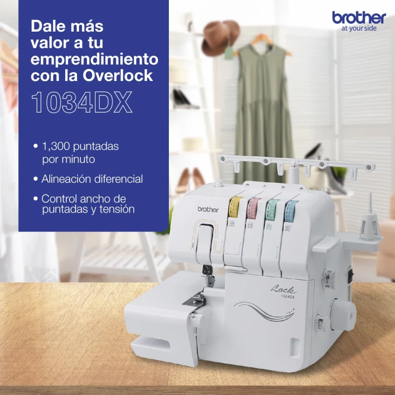 Brother 1034DX. Color del producto: Blanco, Tipo: Máquina de coser de overlock, Funciones de la máquina de coser: Overlock. Tipo de fuente de alimentación: Eléctrico. Ancho: 340 mm, Profundidad: 270 mm, Altura: 310 mm. Ancho del paquete: 290 mm, Largo del paquete: 320 mm, Alto del paquete: 360 mm
