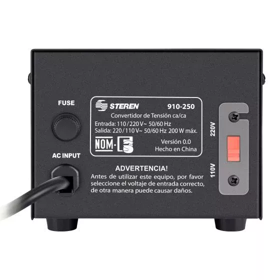 Steren 910-250. Ancho: 125 mm, Profundidad: 130 mm, Altura: 95 mm. Potencia: 200 W, Voltaje de entrada AC: 110 V, Frecuencia de entrada AC: 50 - 60 Hz