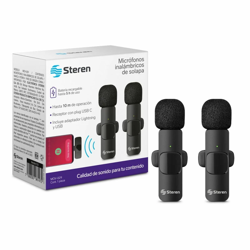 Steren MOV-029. Tipo de micrófono: Micrófono de mano. Tipo de receptor: Receptor de mochila. Tipo de transmisor: Transmisor de bolsillo. Duración de la batería (máxima): 5 h, Tipo de batería: Batería integrada. Cables incluidos: USB Tipo C