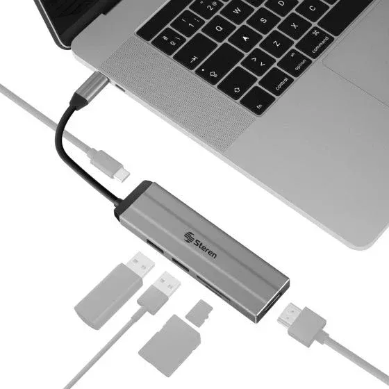 Steren USB-4740. Interfaz de host: USB 2.0 Type-C. Color del producto: Plata, Tarjetas de memoria compatibles: MicroSD (TransFlash), SD, Interfaces de concentradores: HDMI, USB 2.0, USB 3.2 Gen 1 (3.1 Gen 1) Type-A, USB 3.2 Gen 1 (3.1 Gen 1) Type-C. Cantidad por paquete: 1 pieza(s)