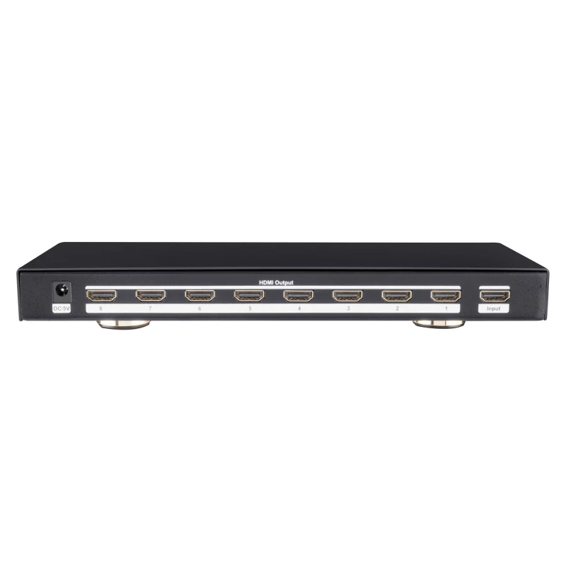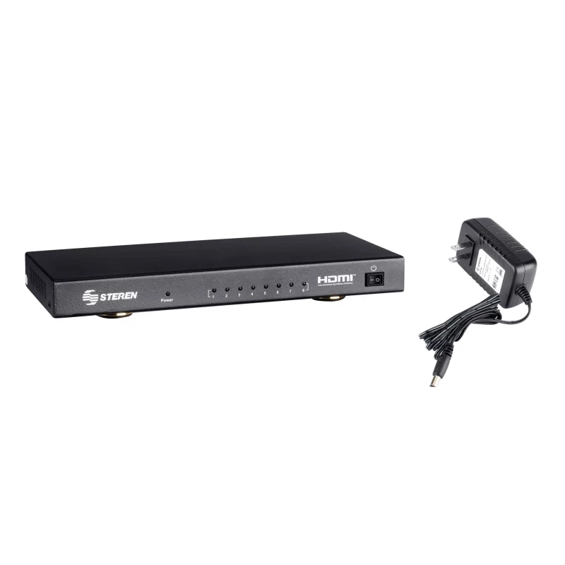 Steren BOS-408. Tipo de puerto de vídeo: HDMI, Salida de vídeo: 8x HDMI. Máxima resolución: 4096 x 2160 Pixeles, Color del producto: Negro, Tipo HD: 4K Ultra HD. Voltaje de entrada AC: 100 - 240 V, Frecuencia de entrada AC: 50 - 60 Hz, Corriente de entrada: 0.5 A. Ancho: 210 mm, Profundidad: 65 mm, Altura: 25 mm. Tipo de empaque: Caja