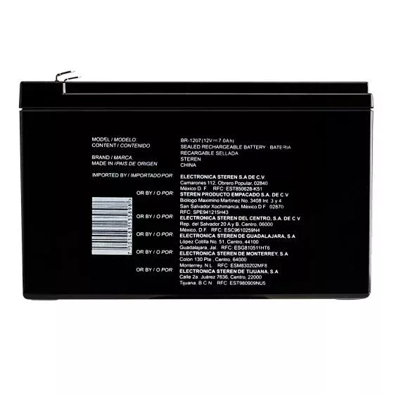 Steren BR-1207. Número de baterías incluidas: 1 pieza(s). Capacidad de batería: 7000 mAh, Tecnología de batería: Sealed Lead Acid (VRLA), Voltaje de la pila: 12 V, Color del producto: Negro