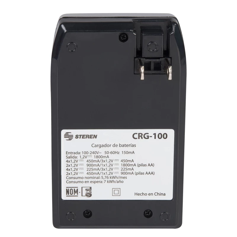 Steren CRG-100. Tipo de alimentación: Corriente alterna, Tecnología de baterías compatibles: Níquel-cadmio (NiCd), Níquel-metal hidruro (NiMH), Tamaño de baterías compatibles: AA, AAAA. Color del producto: Negro, Plata. Voltaje de entrada: 100 - 240 V, Frecuencia de entrada: 50 - 60 Hz, Corriente de entrada: 0.15 A. Ancho: 68 mm, Profundidad: 30 mm, Altura: 105 mm. Cantidad por paquete: 1 pieza(s)