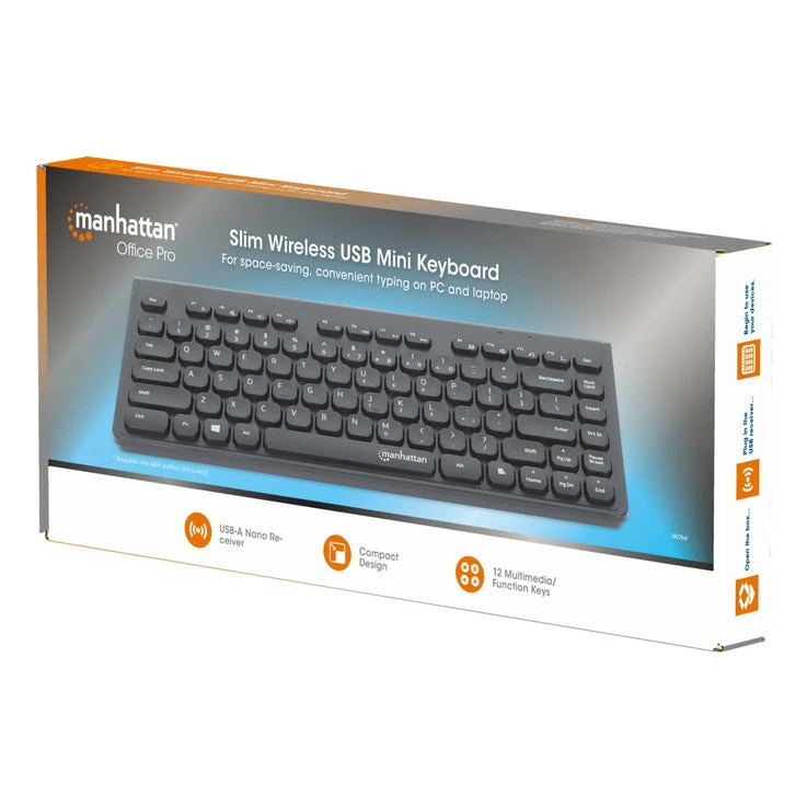 Manhattan Mini teclado USB inalámbrico, 12 teclas multimedia/funcionales, nano receptor USB-A, compacto, formato de perfil delgado, para PC y laptops, negro. Formato del teclado: Mini. Estilo de teclado: Derecho. Tecnología de conectividad: Inalámbrico, Interfaz del dispositivo: RF inalámbrico, Interruptor del teclado: Interruptor de membrana, Diseño de teclado: QWERTY, Teclado, cantidad de teclas: 82, Uso recomendado: Universal. Color del producto: Negro