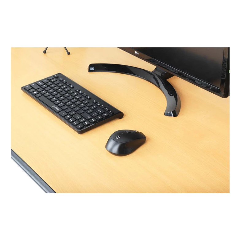 Utiliza el mini teclado inalámbrico USB delgado de Manhattan sobre tu regazo, en tu escritorio o en cualquier lugar que se encuentre a menos de 10 m (33 pies) del adaptador USB-A instalado. Su diseño compacto combina las excelentes características que esperas de un teclado estándar, pero ocupa mucho menos espacio.