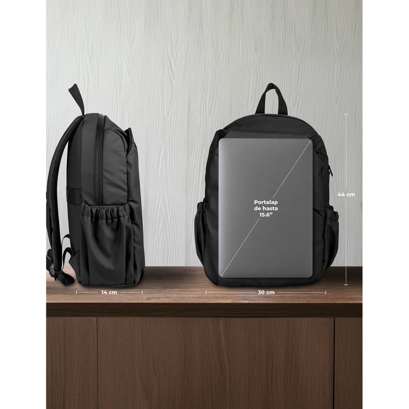 Backpack diseñada con materiales resistentes a salpicaduras para brindar durabilidad y protección. Compatible con laptops de hasta 16”, cuenta con cierres duraderos y compartimientos internos acolchonados que garantizan la seguridad de tu equipo. Además, ofrece dos prácticos compartimientos laterales para botellas y un compartimiento frontal en diagonal para acceso rápido a tus pertenencias. Su diseño funcional y elegante la convierte en la opción perfecta para el trabajo, la universidad o tus viajes diarios.