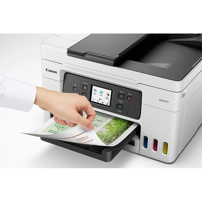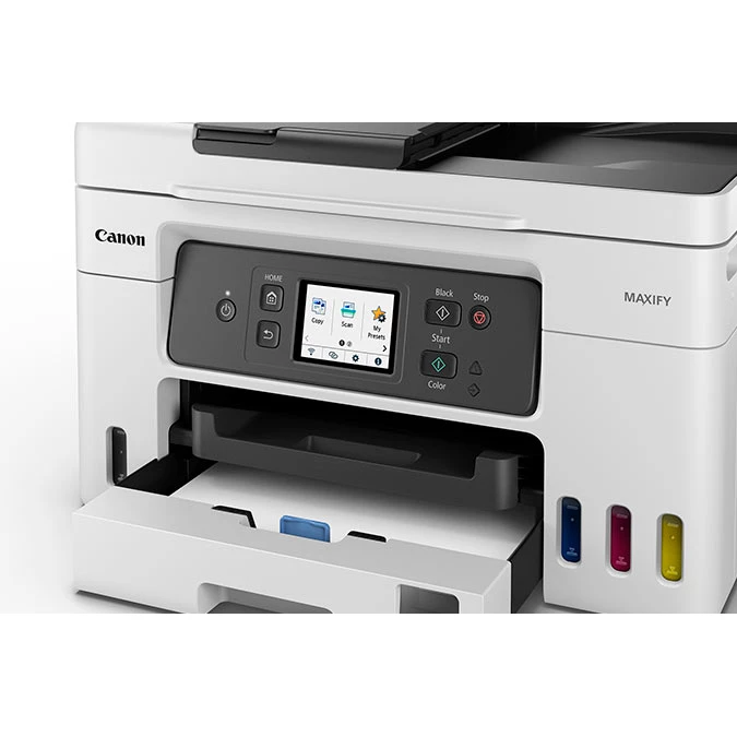 Canon MAXIFY GX4010. Tecnología de impresión: Inyección de tinta, Impresión: Impresión a color, Resolución máxima: 600 x 1200 DPI, Velocidad de impresión (color, calidad normal, A4/US Carta): 18 ppm. Copiando: Copia a color. Escaneando: Escaneo a color, Resolución óptica de escáner: 1200 x 2400 DPI. Enviando por fax: Fax a color. Funciones de doble cara: Copiar, Imprimir. Tamaño máximo de papel ISO A-series: A4. Wifi. Impresión directa. Color del producto: Negro, Blanco