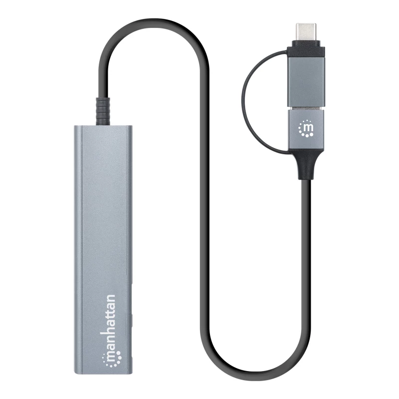 Manhattan Conector adaptable de USB-A macho a USB-C macho, dos puertos USB-C hembra y dos puertos USB-A hembra, USB SuperSpeed a 5 Gbps (USB 3.2 Gen 1), alimentación por bus, aluminio, gris espacial. Interfaz de host: USB 3.2 Gen 1 (3.1 Gen 1) Type-A + Type-C, Interfaces de concentradores: USB 3.2 Gen 1 (3.1 Gen 1) Type-A, USB 3.2 Gen 1 (3.1 Gen 1) Type-C. Velocidad de transferencia de datos: 5000 Mbit/s, Color del producto: Gris, Material de la cubierta: Aluminio. Tipo de fuente de alimentación: USB. Sistemas operativos Windows soportados: Windows 10, Windows 11, Windows 7, Windows 8.1, Windows Vista, Windows XP, Otros sistemas operativos soportados: ChromeOS. Ancho: 25 mm, Profundidad: 104 mm, Altura: 9 mm