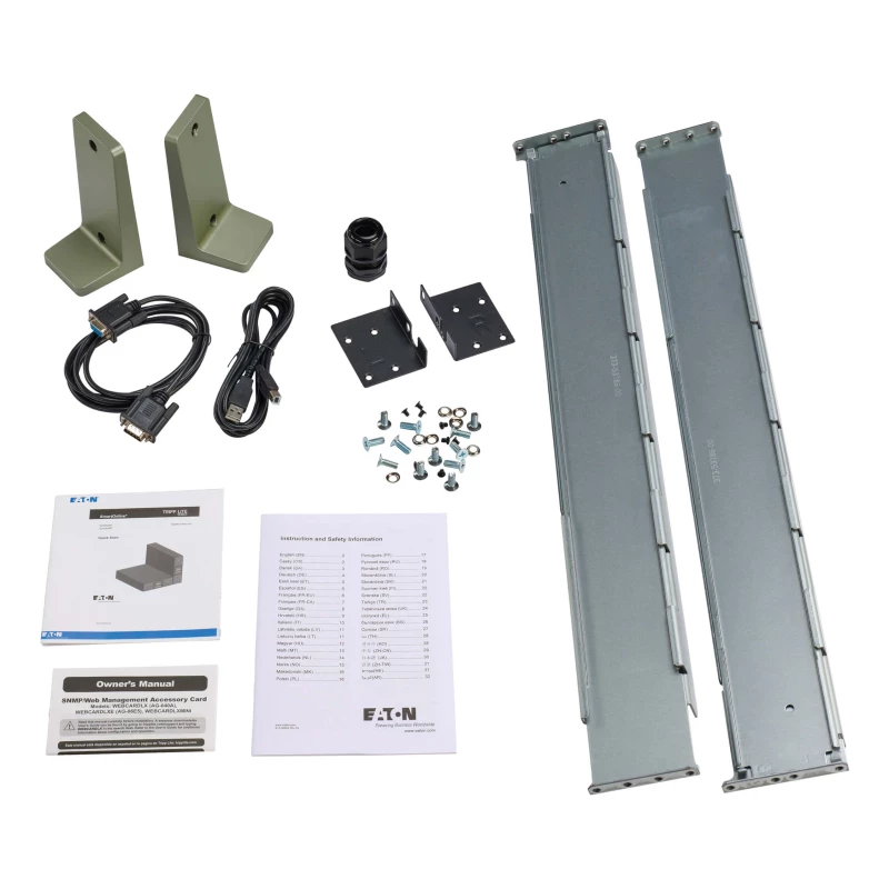 Puede Instalar el SU5000RTFMB en 6U de espacio en un Rack EIA estándar de 19 pulgadas utilizando el kit de raíles de 4 postes incluido o un kit de raíles de 2 postes opcional (RK2PC, vendido por separado, se necesita uno por cada UPS, EBM o transformador). También puede adaptarlo a su instalación en torre utilizando los soportes incluidos. El cable de alimentación de diez pies (3 m) con clavija NEMA L6-30P se conecta a un tomacorriente de CA compatible. Se incluye un pasacables para la entrada alterna de la instalación eléctrica permanente.