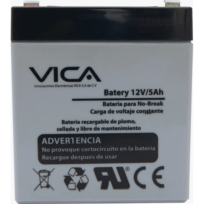 Vica 12V/5AH. Tecnología de batería: Plomo, Voltaje de la pila: 12 V, Número de baterías incluidas: 1 pieza(s). Ancho del paquete: 105 mm, Alto del paquete: 90 mm, Largo del paquete: 70 mm