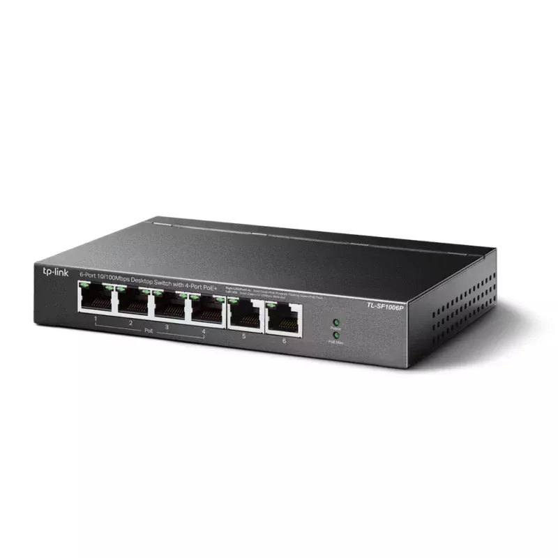 TP-Link TL-SF1006P. Tipo de interruptor: No administrado. Puertos tipo básico de conmutación RJ-45 Ethernet: Fast Ethernet (10/100), Cantidad de puertos básicos de conmutación RJ-45 Ethernet: 6. Bidireccional completo (Full duplex). Tabla de direcciones MAC: 2000 entradas, Capacidad de conmutación: 1.2 Gbit/s. Estándares de red: IEEE 802.3af, IEEE 802.3at. Voltaje de entrada DC: 53.5 V. Energía sobre Ethernet (PoE)