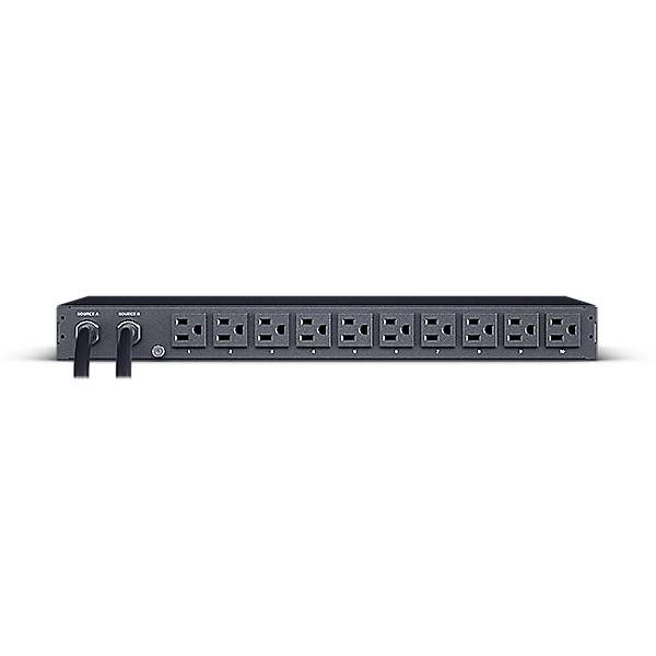 CyberPower PDU24001. PDU tipos: Regulado, Capacidad del rack: 1U, Tipo: Monofásico. Cantidad de salidas AC: 10 salidas AC, Tipo de salida AC: NEMA 5–15R. Longitud de cable: 3.05 m. Voltaje nominal de entrada: 100 - 120 V, Máxima corriente: 12 A, Frecuencia de entrada AC: 50/60 Hz. Ancho: 433 mm, Profundidad: 215 mm, Altura: 44 mm