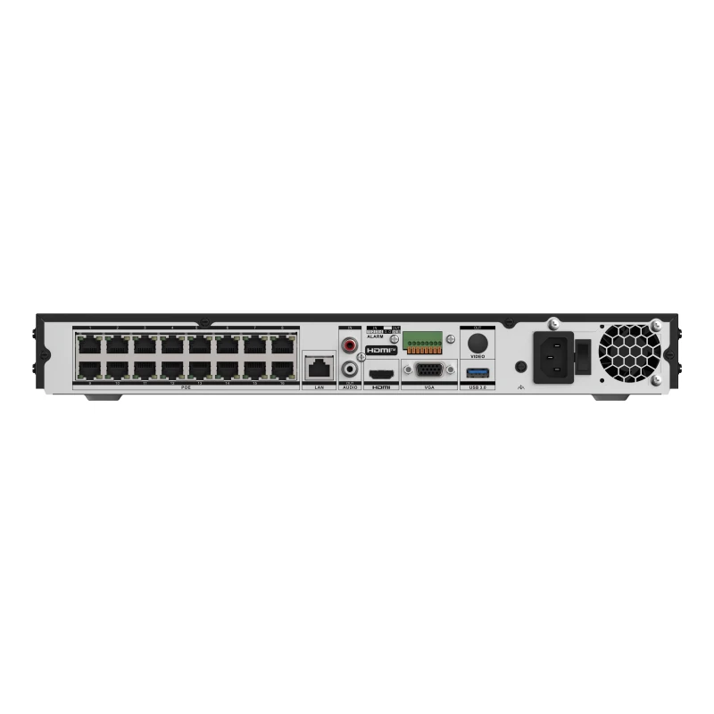 Hikvision DS-7616NXI-I2/16P/VPRO. Canales de entrada de vídeo: 16 canales, Máxima resolución: 3840 x 2160 Pixeles, Número de canales reproducidos simultáneamente: 16 canales. Capacidad máxima de almacenaje: 20 TB, Interfaz del HDD: SATA, SATA II, SATA III. Ethernet LAN, velocidad de transferencia de datos: 10,100,1000 Mbit/s, Estándares de red: IEEE 802.3af, IEEE 802.3at, Protocolos de red compatibles: TCP/IP, DHCP, IPv4, IPv6, DNS, DDNS, NTP, RTSP, SADP, SMTP, SNMP, NFS, iSCSI, ISUP, UPnP™, HTTP,.... Capacidad del rack: 1U, Color del producto: Negro, Certificación: CE, CB, REACH, WEEE, UKCA, RCM,IC,LOA,KC. Consumo de energía (máx.): 180 W, Consumo energético: 50 W, Voltaje de entrada AC: 100 - 240 V