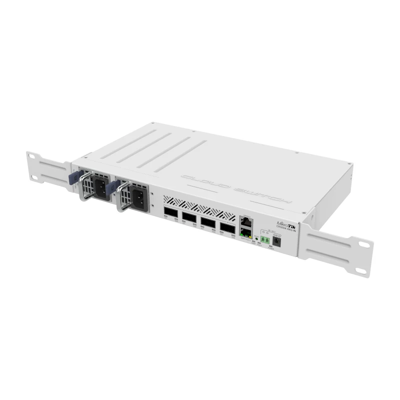 Mikrotik CRS504-4XQ-IN. Tipo de interruptor: Gestionado. Puertos tipo básico de conmutación RJ-45 Ethernet: Fast Ethernet (10/100), Cantidad de puertos básicos de conmutación RJ-45 Ethernet: 1, Puerto de consola: RJ-45. Estándares de red: IEEE 802.3bt. Voltaje de entrada DC: 36 - 57 V. Energía sobre Ethernet (PoE). Montaje en rack