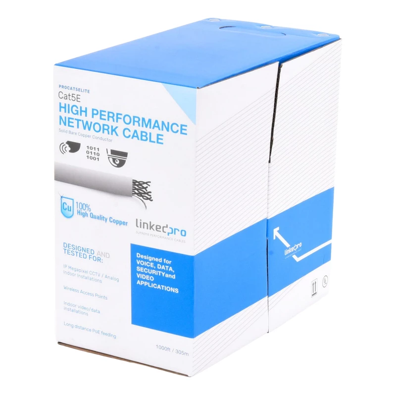 LinkedPRO PRO-CAT-5E-LITE. Longitud de cable: 305 m, Cable estándar: Cat5e, Blindaje de cable: U/UTP (UTP), Velocidad de transferencia de datos: 1000 Mbit/s, Color del producto: Gris
