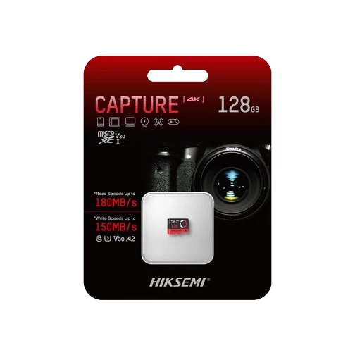 Hiksemi HS-TF-E3 128G. Capacidad: 128 GB, Tipo de tarjeta flash: MicroSDXC, Clase de memoria flash: Clase 10, Tipo de memoria interna: TLC, Velocidad de lectura: 180 MB/s, Velocidad de escritura: 150 MB/s, Clase de velocidad UHS: Class 3 (U3), Clase de velocidad de vídeo: V30. Funciones de protección: Resistente a golpes, Resistente a la temperatura, Resistente al agua, A prueba de rayos X, Color del producto: Rojo