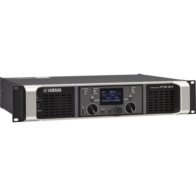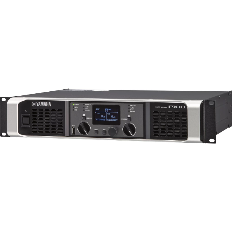Yamaha PX10. Potencia pico por canal: 1200 W, Amplificador de clase: D, THD, distorsión armónica total: 0.1%. Tipo de conectividad de bocina: Poste de encuadernación/NL4. Frecuencia de entrada AC: 50 - 60 Hz, Consumo energético: 310 W. Ancho: 480 mm, Profundidad: 388 mm, Altura: 88 mm
