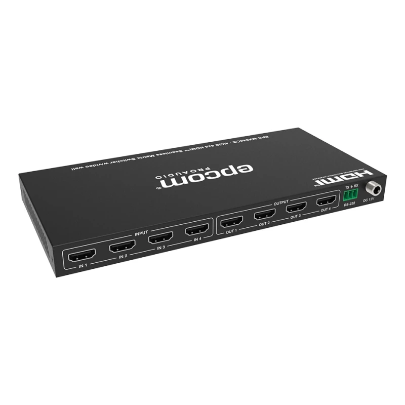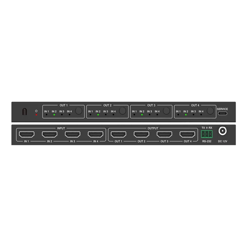 Este es un conmutador matricial 4x4 sin interrupciones que también puede utilizarse como procesador de video wall. En modo conmutador, puede mostrar cualquiera de las 4 entradas HDMI en cualquiera de las 4 salidas HDMI. En modo video wall, divida una pantalla en 2 a 4 dispositivos, creando una pantalla gigante con múltiples pantallas. Este producto cumple con HDCP y admite resoluciones de hasta 4K2K@30. Las resoluciones de salida HDMI pueden escalarse hacia arriba o hacia abajo a 1080P/720P/1920x1200/4K30. El producto puede controlarse mediante los botones del panel frontal, el control remoto IR y los comandos RS-232. Este producto multifuncional puede utilizarse ampliamente en diversas aplicaciones como demostraciones, videoconferencias y enseñanza multimedia.