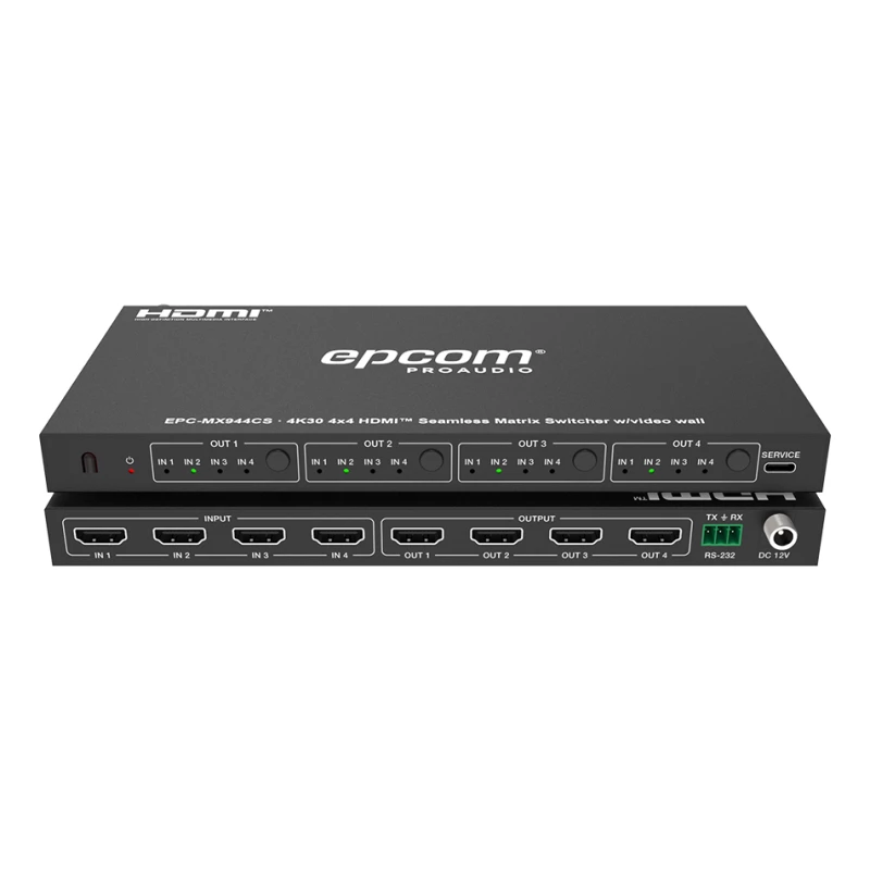 Epcom EPC-MX944CS. Tipo de producto: Interruptor de la matriz AV, Velocidad de transferencia de datos: 10.2 Gbit/s, Máxima resolución: 4096 x 2160 Pixeles. Color de la carcasa: Negro, Material de la cubierta: Metal. Versión HDMI: 1.4b, Tipo de conector USB: USB Tipo C. Consumo de energía (máx.): 3.6 W, Voltaje de entrada AC: 100-240 V, Frecuencia de entrada AC: 50/60 Hz. Ancho: 220 mm, Profundidad: 105 mm, Altura: 19 mm