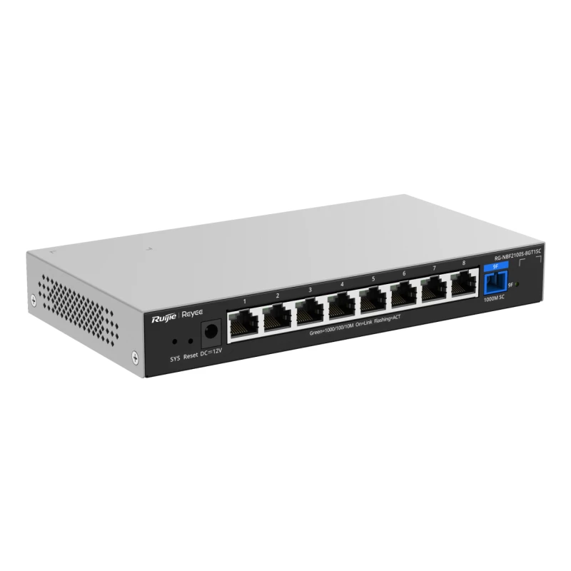 Ruijie Networks RG-NBF2100S-8GT1SC. Tipo de interruptor: Gestionado, Capa del interruptor: L2. Cantidad de puertos básicos de conmutación RJ-45 Ethernet: 8. Tabla de direcciones MAC: 8 entradas, Capacidad de conmutación: 19 Gbit/s. Montaje en rack
