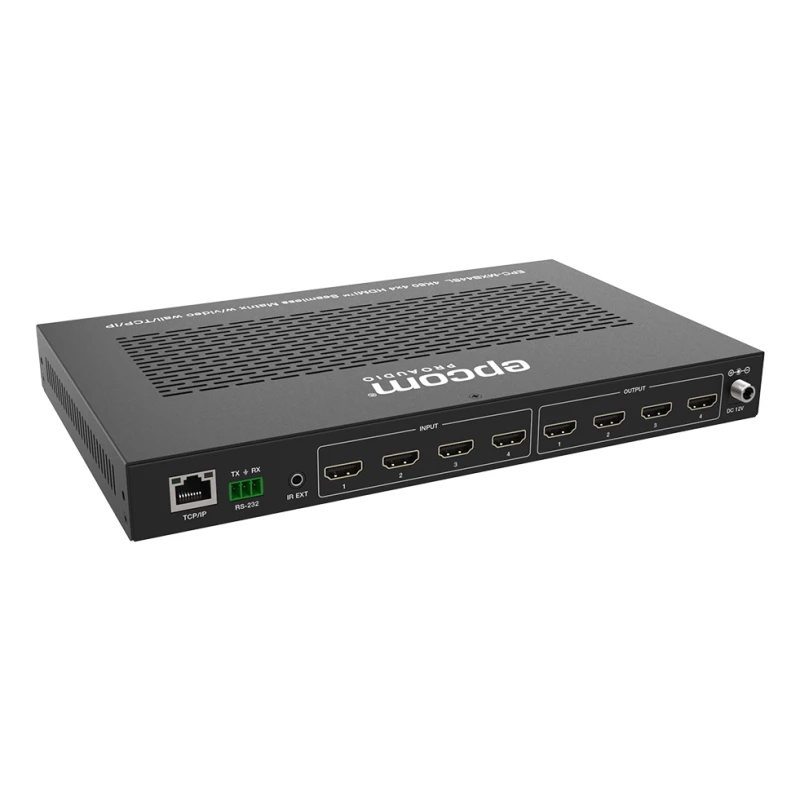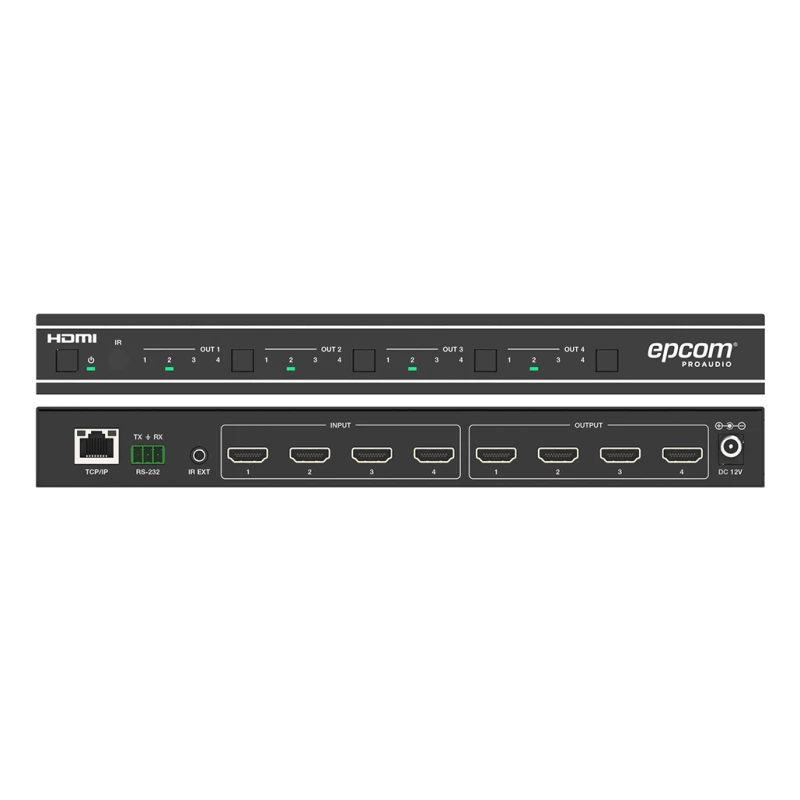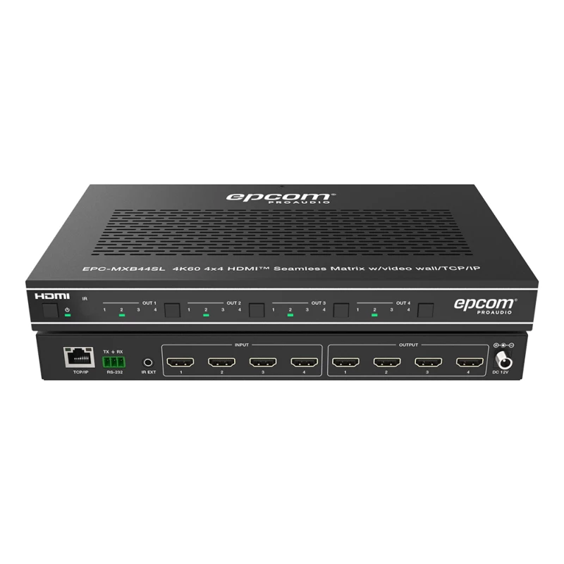 Epcom EPC-MXB44SL. Tipo de producto: Interruptor de la matriz AV, Velocidad de transferencia de datos: 18 Gbit/s, Máxima resolución: 4096 x 2160 Pixeles. Color de la carcasa: Negro, Material de la cubierta: Metal. Versión HDMI: 2.0b. Consumo de energía (máx.): 19.56 W, Voltaje de entrada AC: 100-240 V, Frecuencia de entrada AC: 50/60 Hz. Ancho: 270 mm, Profundidad: 166 mm, Altura: 30 mm