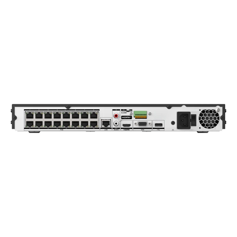 Hikvision DS-7616NXI-K2/16P(E). Canales de entrada de vídeo: 16 canales, Máxima resolución: 3840 x 2160 Pixeles, Número de canales reproducidos simultáneamente: 16 canales. Capacidad del HDD: 16 TB, Capacidad máxima de almacenaje: 32 TB, Interfaz del HDD: SATA. Ethernet LAN, velocidad de transferencia de datos: 10,1000,100 Mbit/s, Estándares de red: IEEE 802.3af, IEEE 802.3at, Protocolos de red compatibles: TCP/IP, DHCP, IPv4, IPv6, DNS, DDNS, NTP, RTSP, SADP, SMTP, SNMP, NFS, iSCSI, ISUP, UPnP, HTTP,.... Capacidad del rack: 1U, Color del producto: Negro, Certificación: CE,CB,REACH,WEEE,UKCA,RCM,IC. Consumo energético: 15 W, Voltaje de entrada AC: 100 - 240 V, Frecuencia de entrada AC: 50 - 60 Hz