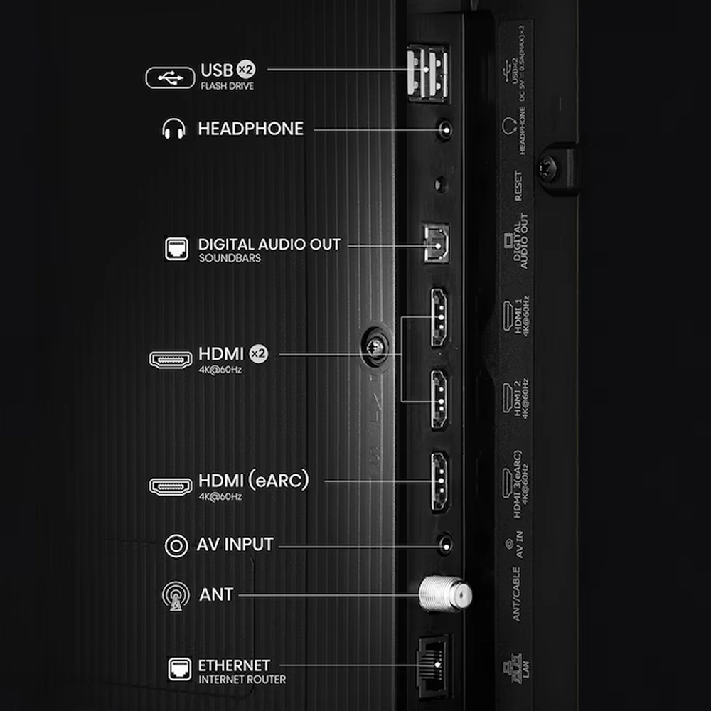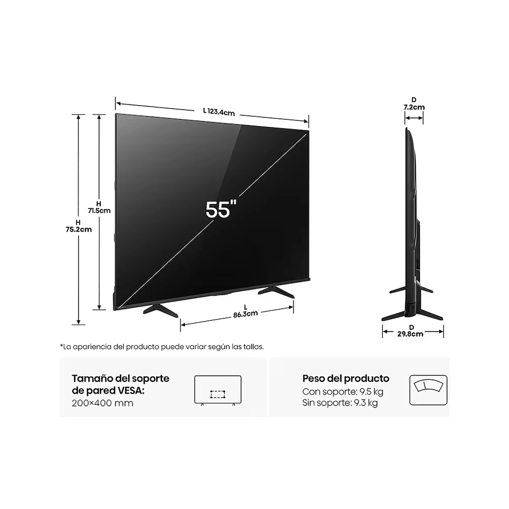 Esta pantalla de 55 pulgadas ofrece una calidad de imagen superior con resolución 4K y compatibilidad con formatos HDR10 y Dolby Vision para contrastes profundos. Incorpora el sistema operativo VIDAA que permite una navegación rápida entre aplicaciones de streaming y cuenta con tecnología DTS Virtual X para un audio envolvente. Su diseño sin marcos y conectividad WiFi integrada la convierten en el centro de entretenimiento ideal.