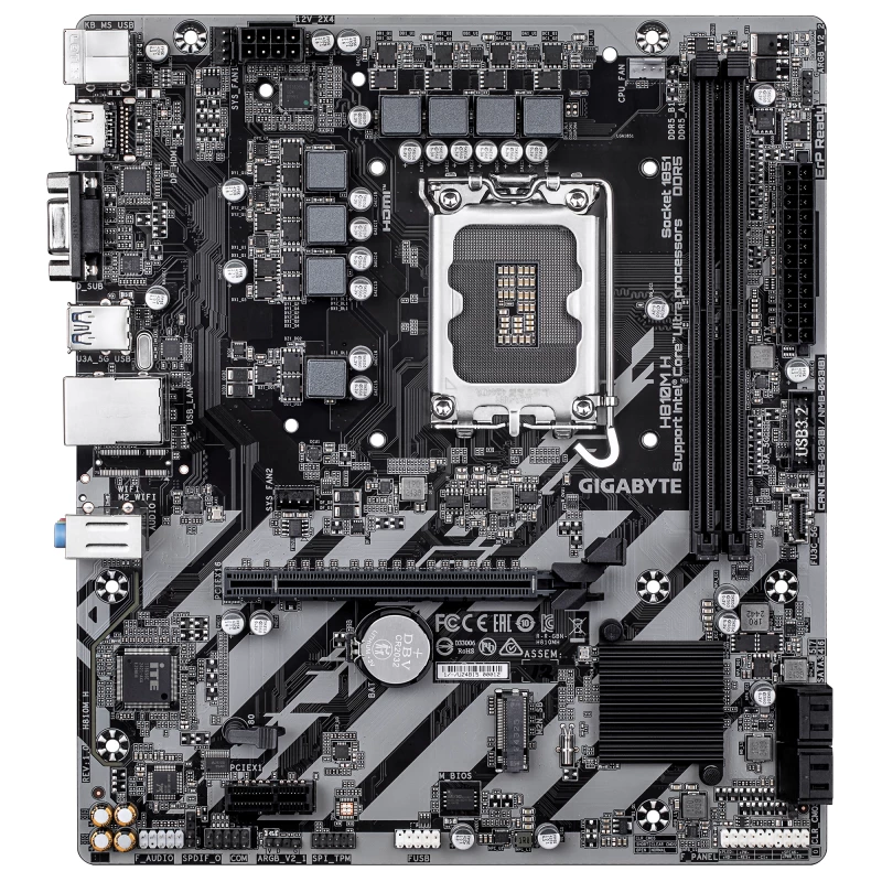 GIGABYTE H810M H. Fabricante de procesador: Intel, Socket de procesador: LGA 1851 (Socket V1), Procesador compatible: Intel Core Ultra (Series 2). tipos de memoria compatibles: DDR5-SDRAM, Memoria interna máxima: 128 GB, Tipo de ranuras de memoria: DIMM. Interfaces de disco de almacenamiento soportados: M.2, PCI Express 4.0, SATA III, Tipos de unidades de almacenamiento admitidas: HDD & SSD, Niveles RAID: 0, 1, 5, 10. Máxima resolución: 4096 x 2160 Pixeles. Tipo de interfaz ethernet: Gigabit Ethernet, Controlador LAN: Realtek RTL8111H