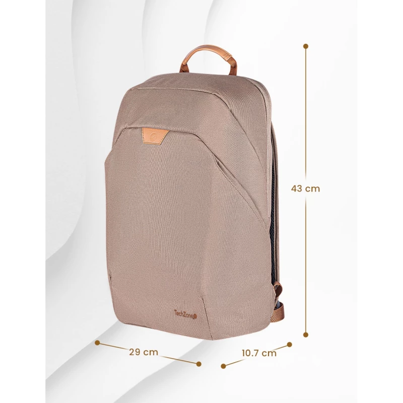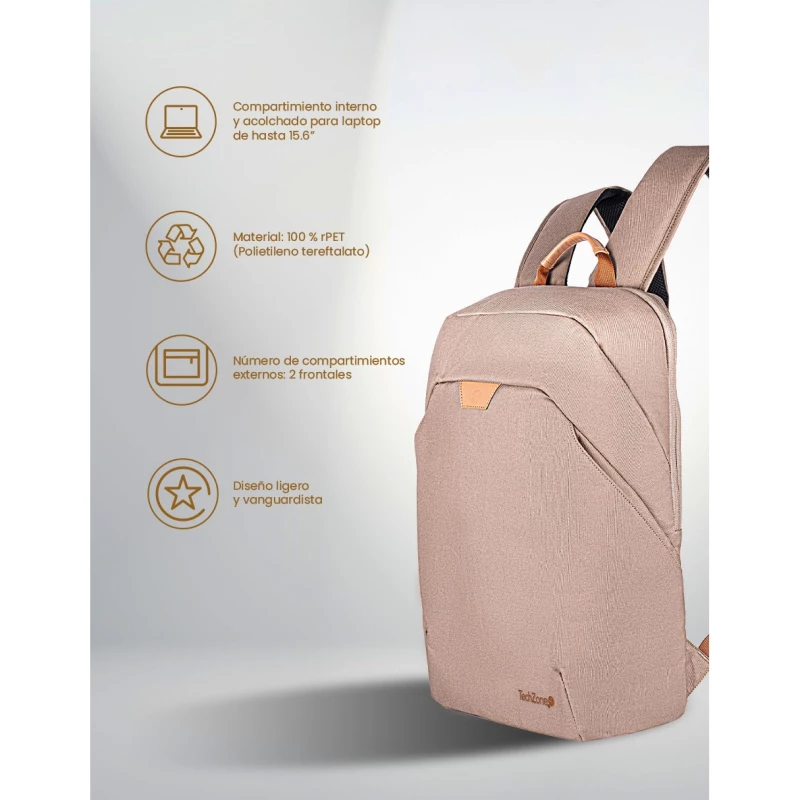TechZone TZLBP56W-C. Tipo mochila para la espalda: Mochila, Color principal del producto: Color camel, Coloración: Monocromático. Ancho: 290 mm, Profundidad: 107 mm, Altura: 430 mm. Ancho del paquete: 290 mm, Largo del paquete: 107 mm, Alto del paquete: 430 mm. Materiales: Tereftalato de polietileno reciclado (rPET)