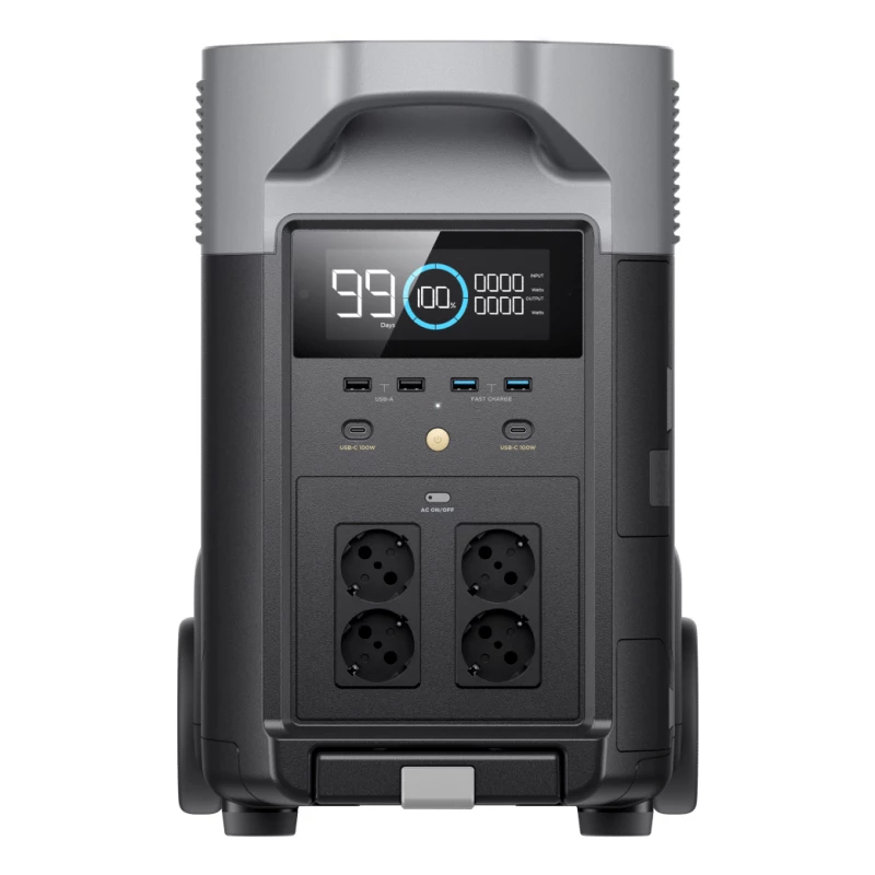 EcoFlow Delta Pro Kit. Tecnología de batería: Fosfato de hierro-litio (LiFePo4), Fuente de carga: Corriente alterna, Encendedor de puros, Solar, Capacidad de batería: 3600 Wh. Color del producto: Negro, Forma: Rectángulo, Tipo de visualizador: LCD. Cantidad de salidas AC: 4 salidas AC, Tipo de conector USB: USB tipo A, USB Tipo C. Certificación: CE, WEEE, CTP, RCM, KC. Ancho: 284 mm, Profundidad: 635 mm, Altura: 420 mm