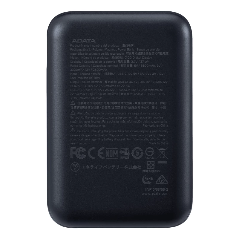 ADATA C100. Capacidad de batería: 10000 mAh, Tecnología de batería: Polímero de litio, Tecnología de carga rápida: Power Delivery 3.0, Quick Charge 3.0, Voltaje de la pila: 3.7 V. USB A número de salidas: 1, Número de puertos USB Tipo C: 1. Potencia total de salida: 15 W. Color del producto: Negro