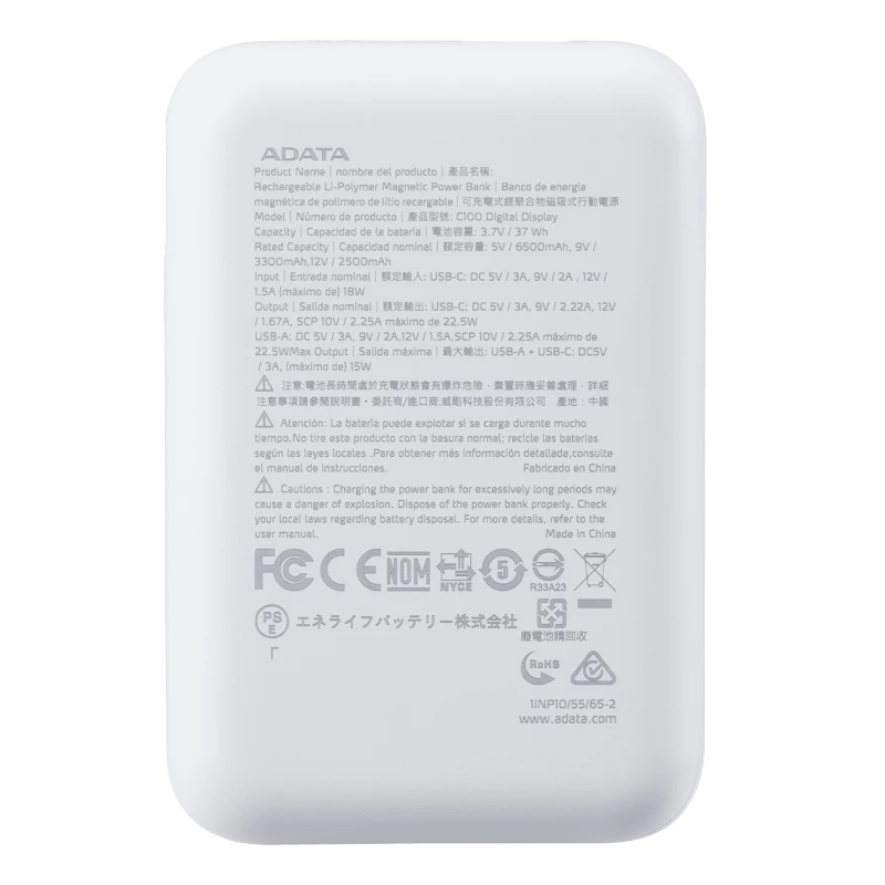 ADATA C100. Capacidad de batería: 10000 mAh, Tecnología de batería: Polímero de litio, Tecnología de carga rápida: Power Delivery 3.0, Quick Charge 3.0, Voltaje de la pila: 3.7 V. USB A número de salidas: 1, Número de puertos USB Tipo C: 1. Potencia total de salida: 15 W. Color del producto: Blanco