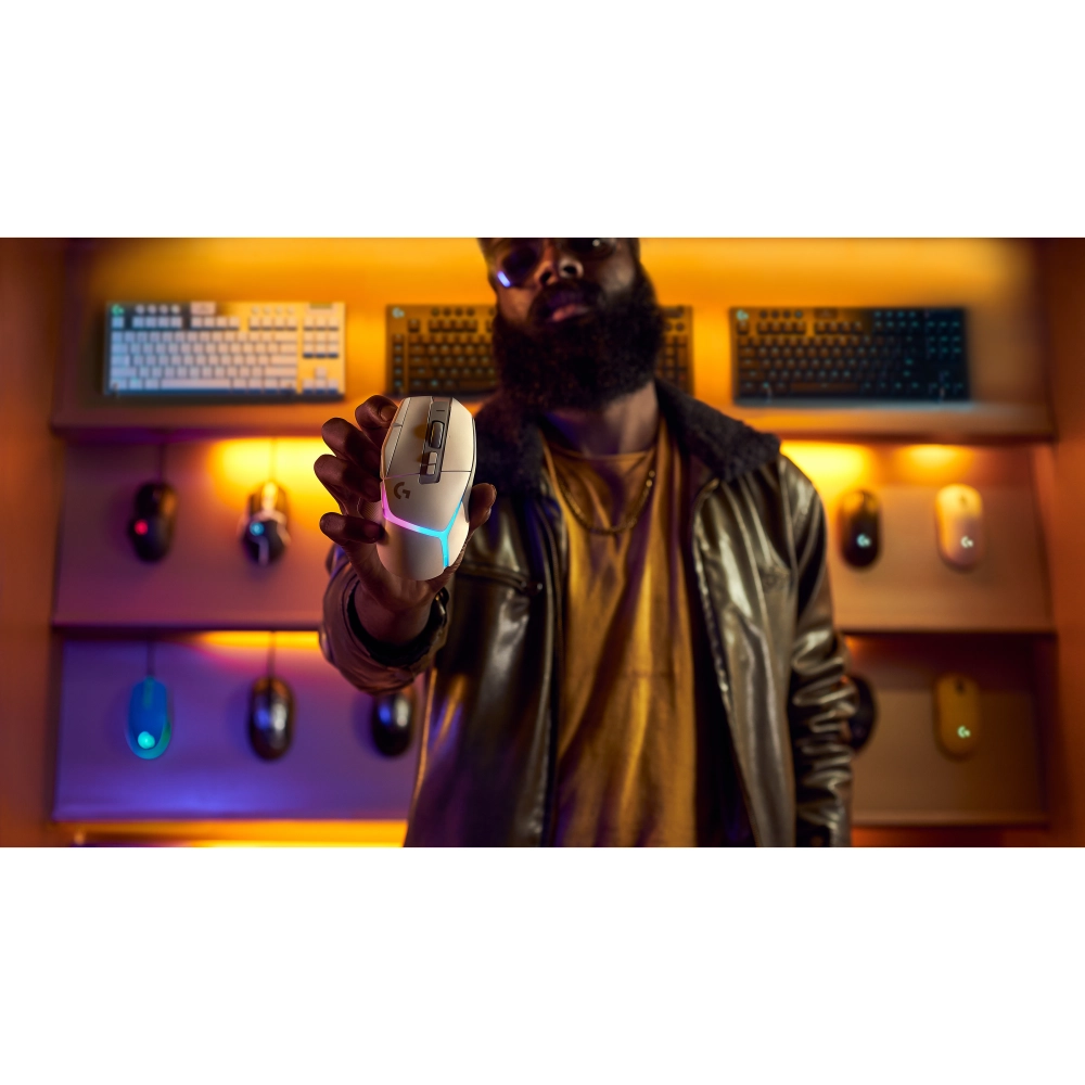 Logitech G G502 X PLUS. Factor de forma: Diestro. Tecnología de detección de movimientos: Óptico, Interfaz del dispositivo: RF inalámbrico, Resolución de movimiento: 25600 DPI, Tipo de botones: Botones presionados, Cantidad de botones: 13, Tipo de desplazamiento: Rueda, Aceleración (máx.): 40 G. Fuente de energía: Baterías. Color del producto: Blanco