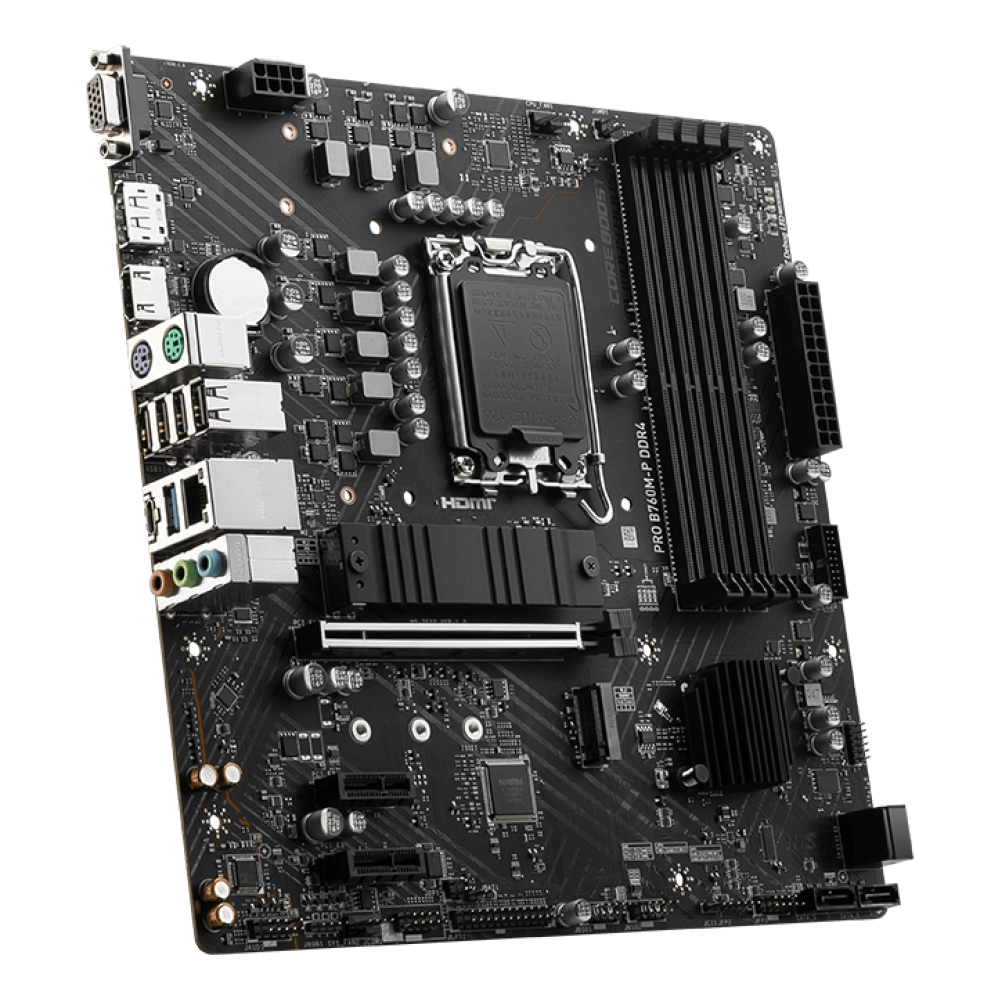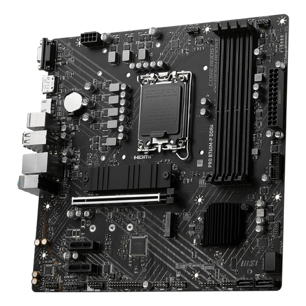 MSI PRO B760M-P DDR4. Fabricante de procesador: Intel, Socket de procesador: LGA 1700, Procesador compatible: Intel® Celeron®, Intel® Pentium® Gold. tipos de memoria compatibles: DDR4-SDRAM, Memoria interna máxima: 128 GB, Tipo de ranuras de memoria: DIMM. Interfaces de disco de almacenamiento soportados: M.2, SATA III, Niveles RAID: 0, 1, 5, 10. Tipo de interfaz ethernet: 2.5 Gigabit Ethernet. Componente para: PC, Factor de forma de la tarjeta madre: Micro ATX, Familia del chipset: Intel