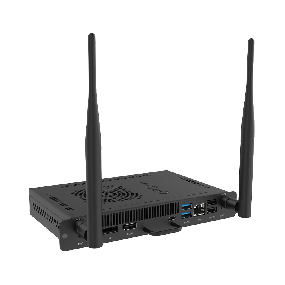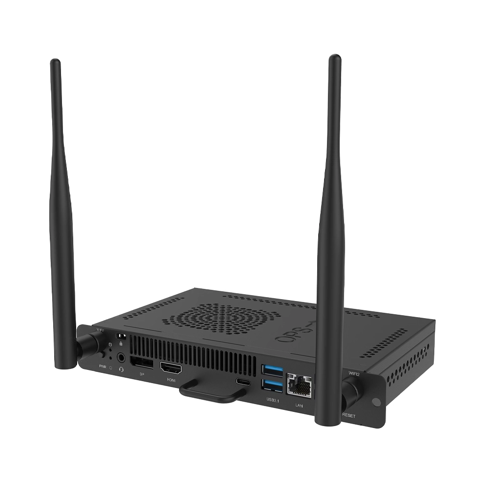 Procesador Intel Core i5 1235U con 10 núcleos y frecuencia de 4.4 GHz sobre un chipset Intel SoC. Chasis formato OPS Slot-in con fuente de alimentación de 60 W, conectividad Ethernet 10/100/1000 Mbps y memoria DDR4 de 16 GB para integración en pantallas interactivas.